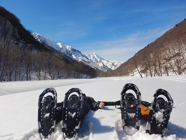 スノーシューを履いて雪の森を歩いて散策するツアーです。一ノ倉沢コース、大幽洞窟コース、雨呼山コースなどコースが楽しめます。
